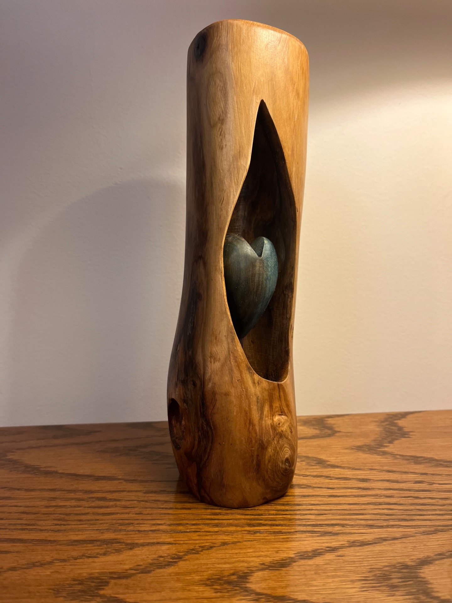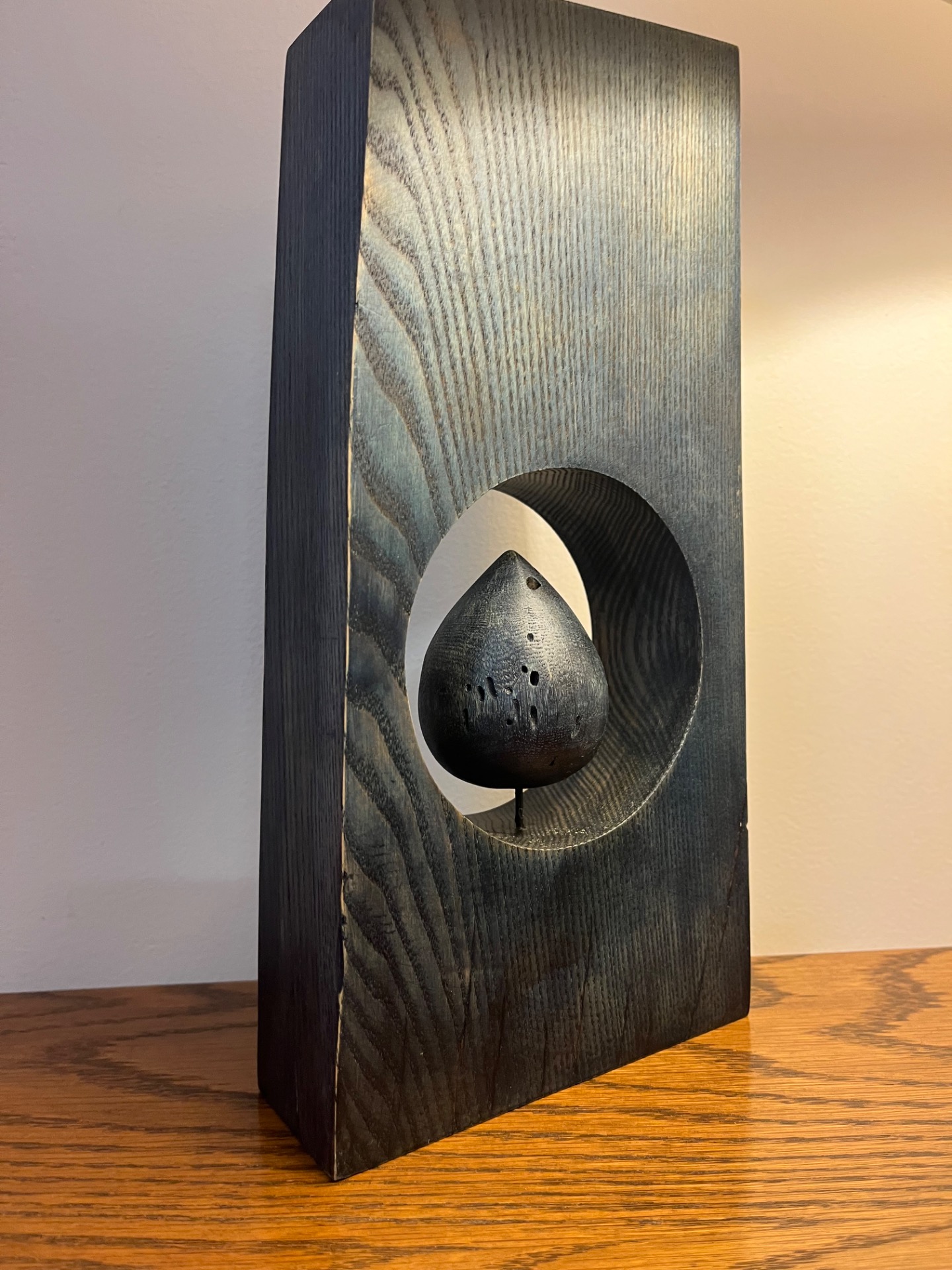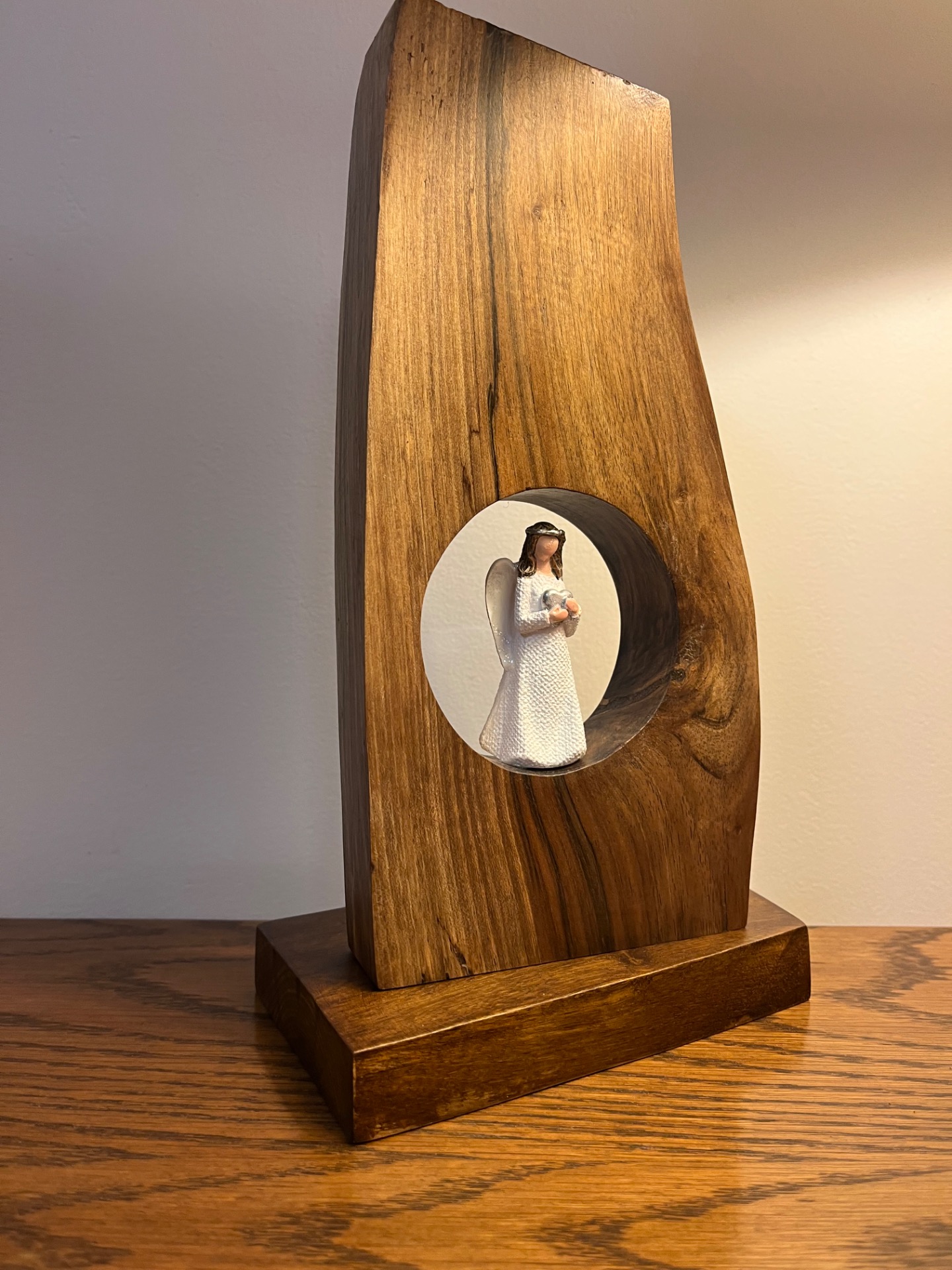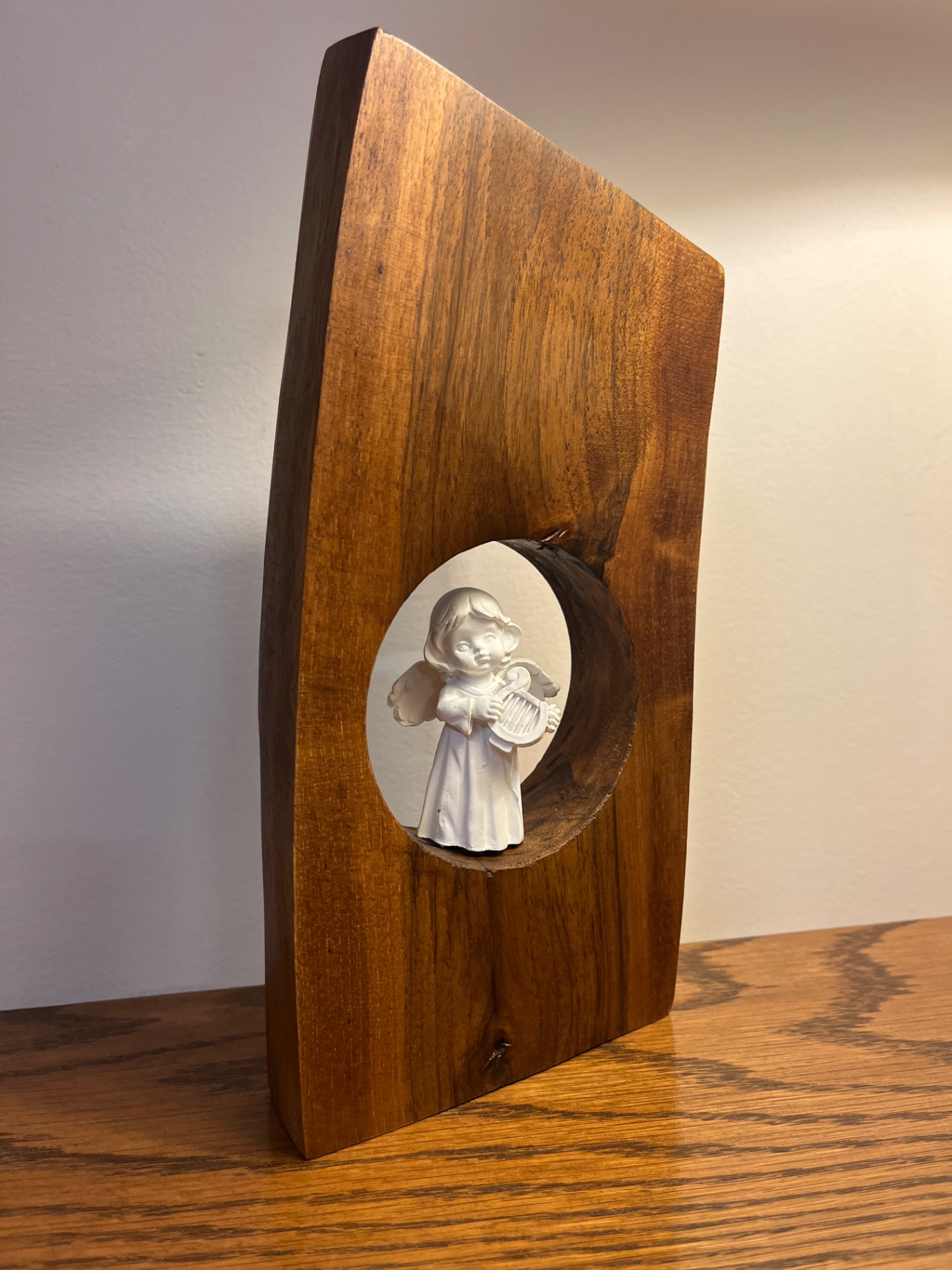 (latinsky "záře / přítomnost") Ručně vytvořený objekt z masivního ořechu vytváří klidný prostor kolem figury. Dutina zesiluje pocit ticha, soustředění a jemné ochrany, která nenápadně formuje atmosféru interiéru. Dřevo: ořech Rozměry: 24 × 12 cm