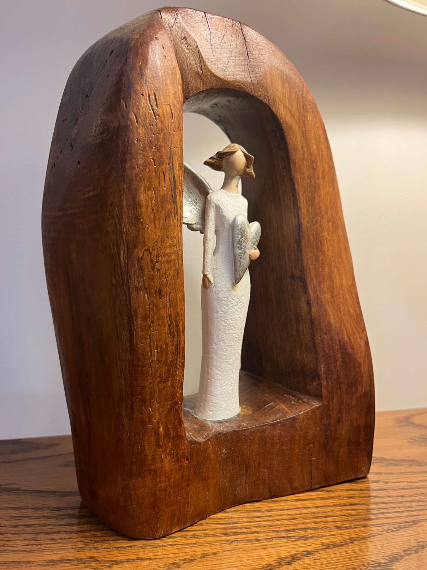(latinsky "ochrana / útočiště") Ručně vytvořený objekt z masivního ořechu vytváří tichý rám kolem figury. Oblouk symbolizuje ochranu, klid a stabilitu, které jemně ukotvují prostor a podporují pocit bezpečí. Dřevo: ořech Rozměry: 26 × 16 cm