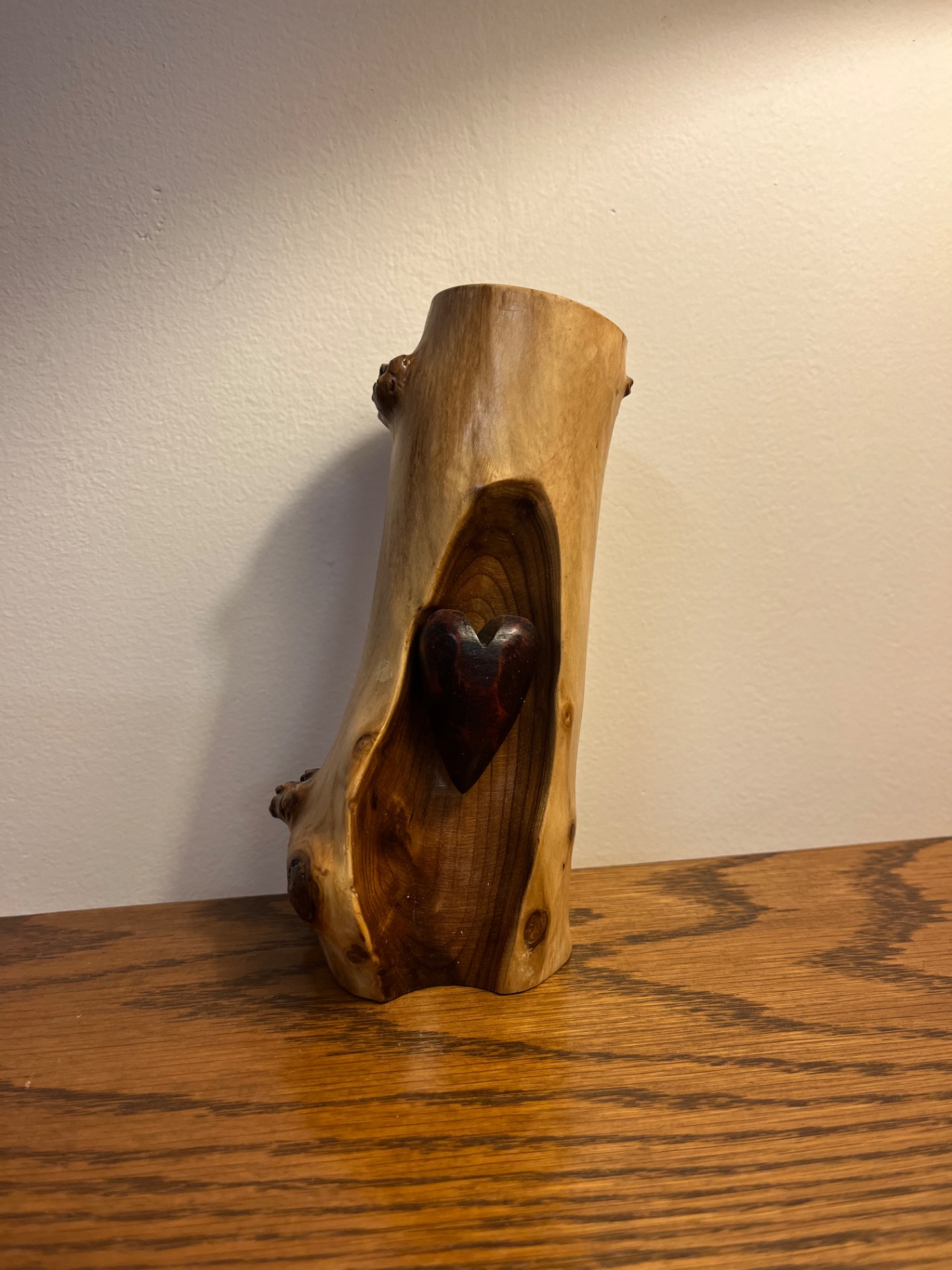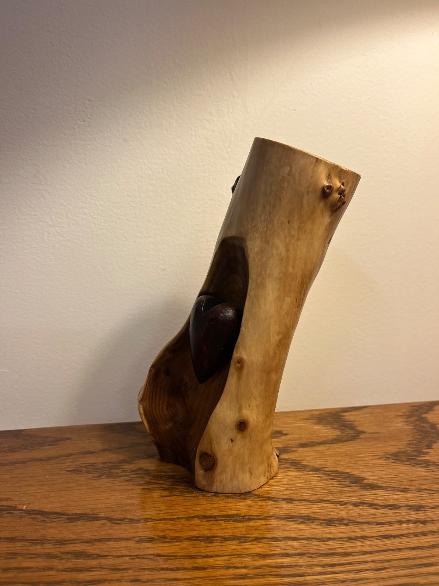 Ručně vytvořený objekt z trnky s lipovým srdcem. Kontrast světlého a tmavého dřeva vyjadřuje ochranu, jemnost a tichou sílu ukrytou v přirozeném tvaru, nesoucím klid, teplo a intimitu prostoru domova.