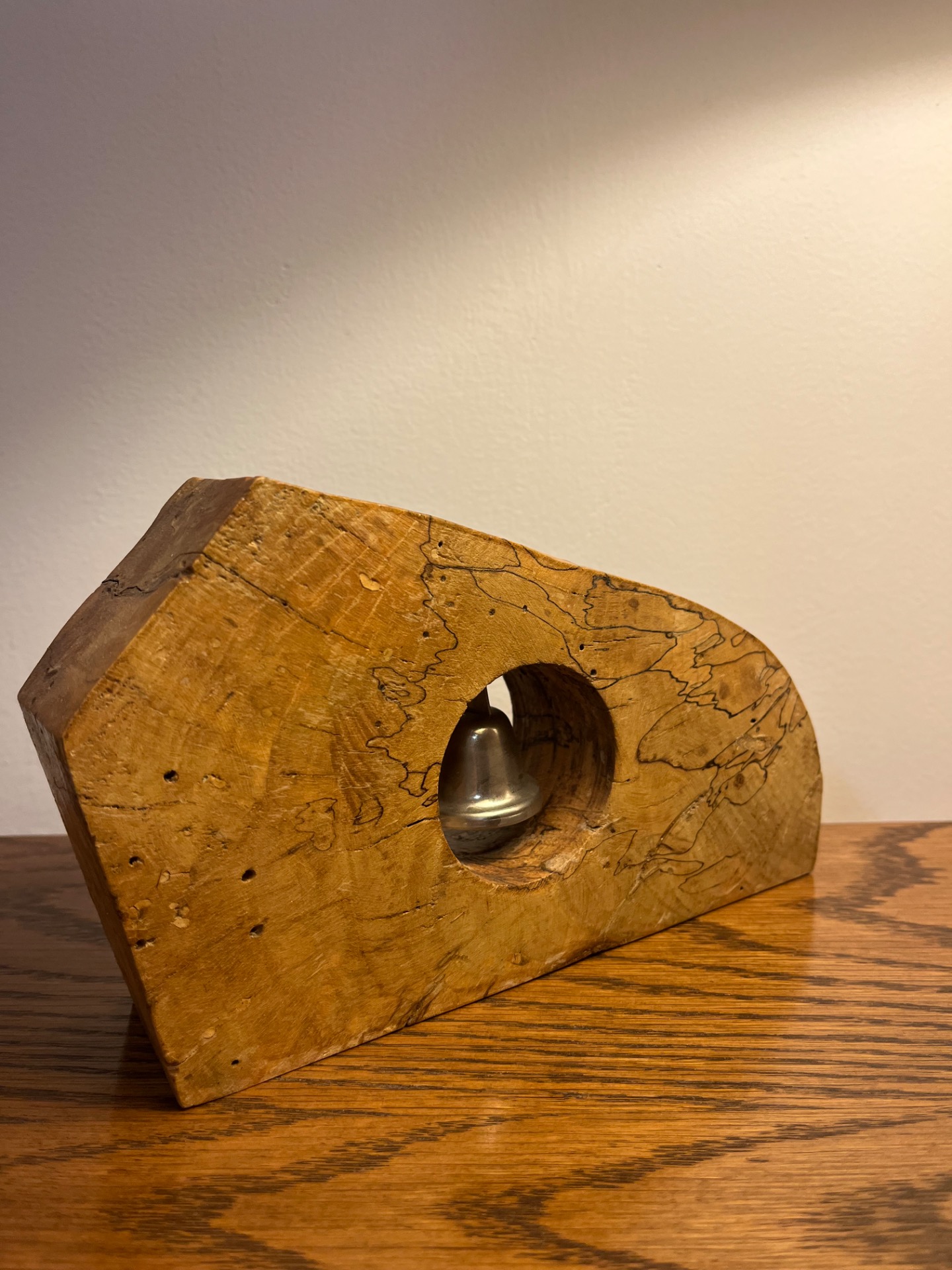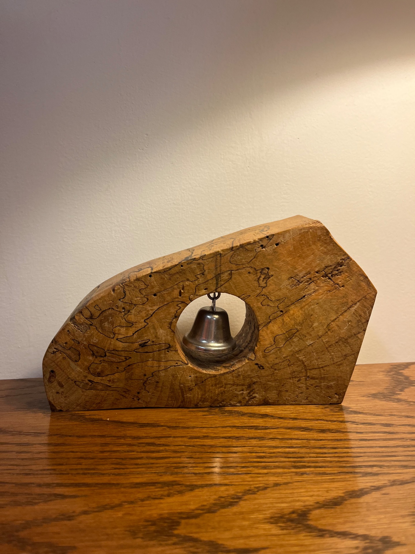 Ručně vytvořený dřevěný objekt z kaštanu s kovovým zvonečkem. Jemný zvuk doplňuje surový tvar, vytváří klidný akcent prostoru, rytmus ticha a moment soustředění.