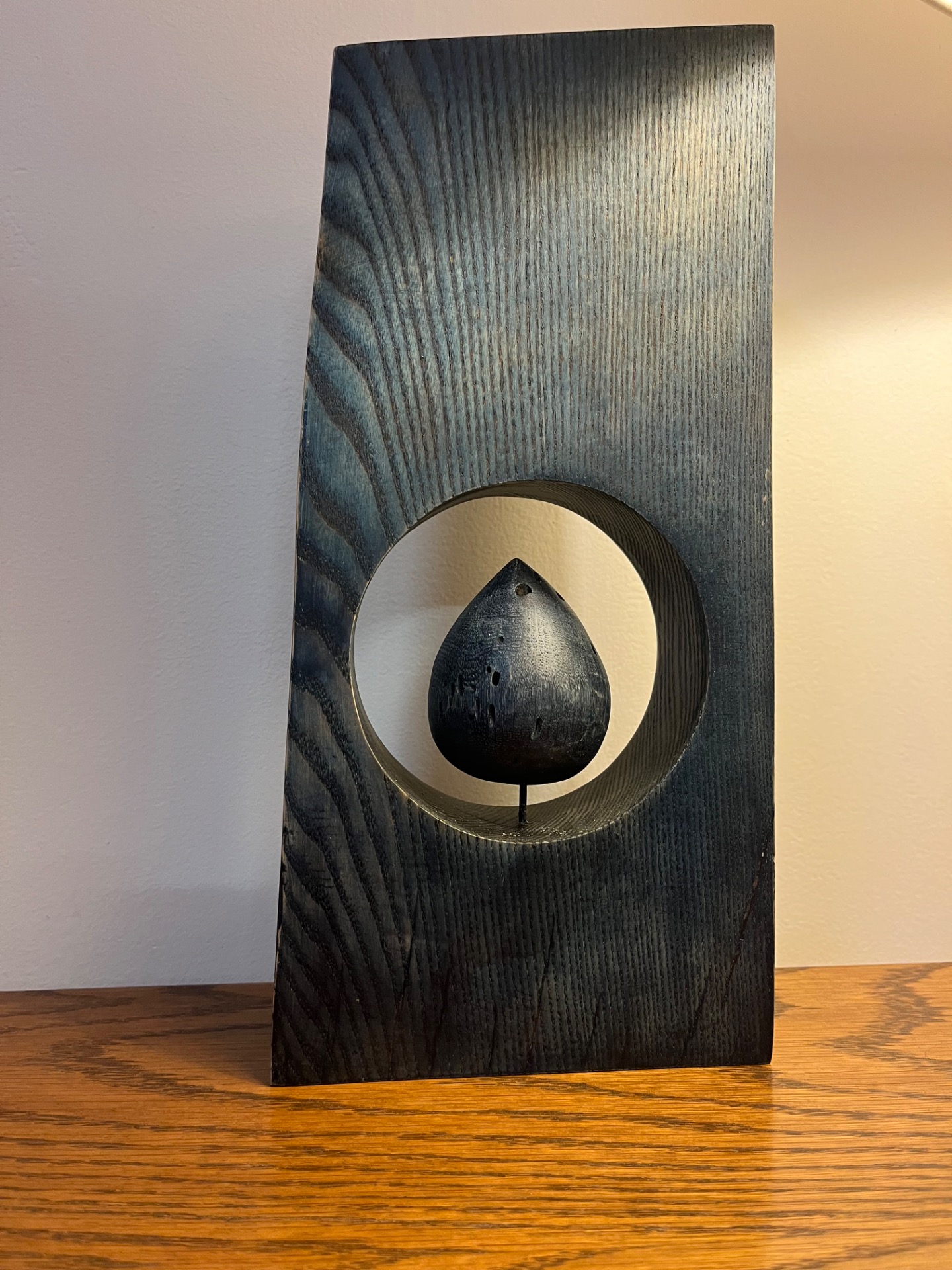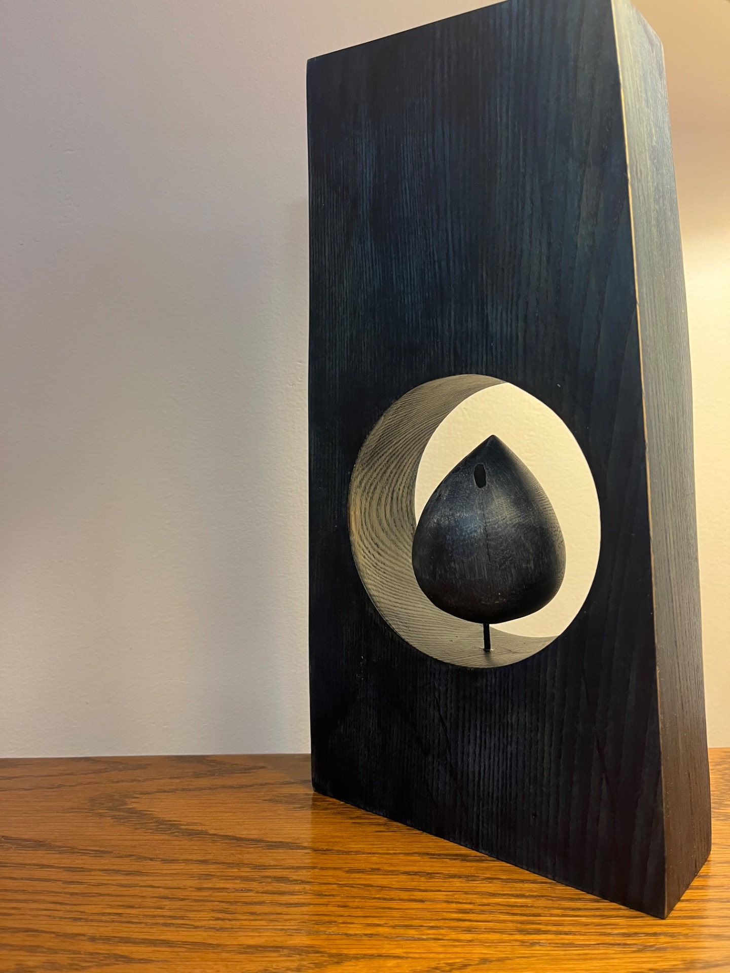 Ručně vytvořený objekt z jasanu s dubovým středem. Kontrast světla a hloubky vytváří klidný, soustředěný akcent prostoru.